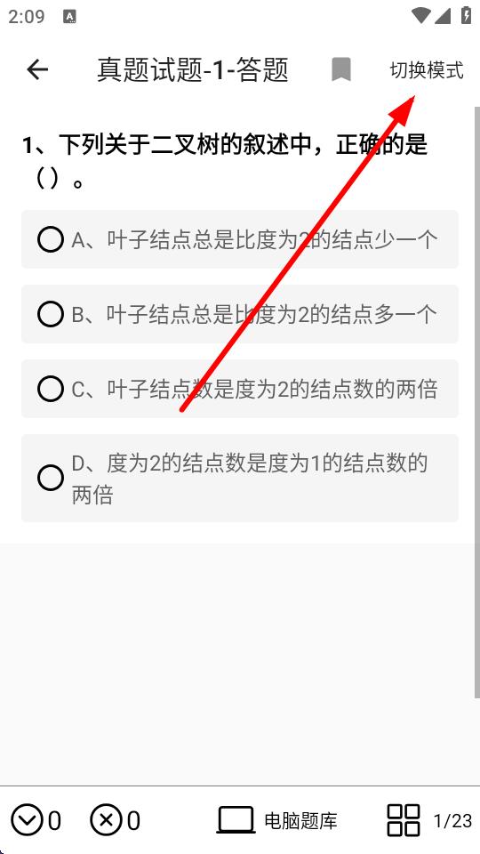 3、在真題答題的界面,點(diǎn)擊右上角切換模式,切換到學(xué)習(xí)的模式。