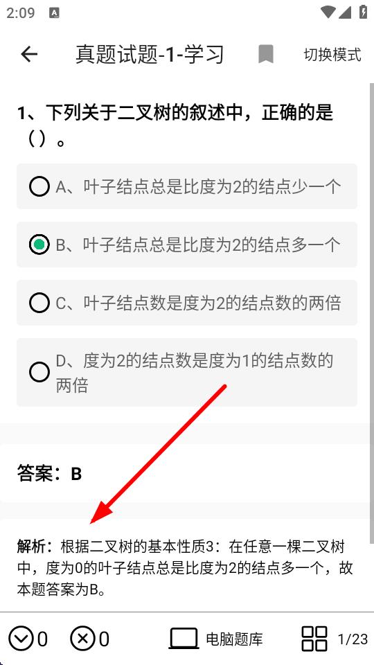4、在學(xué)習(xí)模式下,即可查看題目解析,如二叉樹(shù)題目解析內(nèi)容。