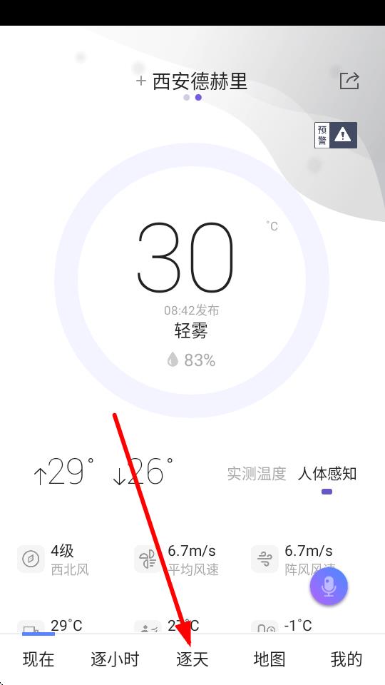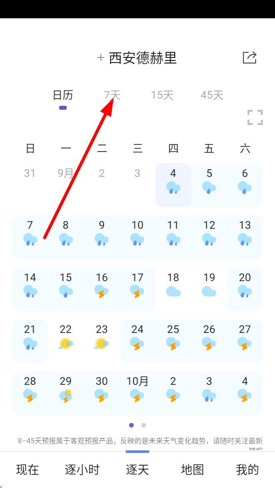 1、打開中國天氣APP,在主界面點擊下方導航欄中的逐天選項。