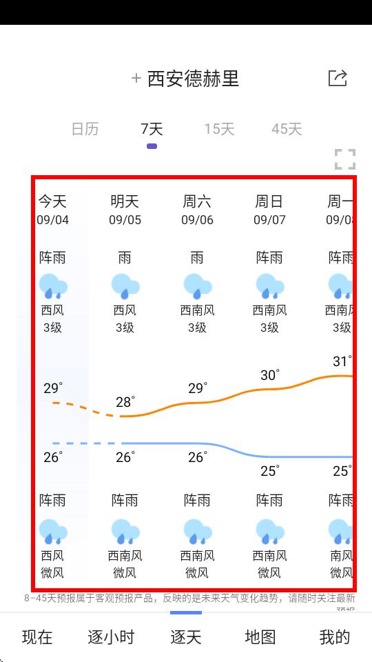 3、頁面會展示未來一周的天氣預報,包括每天的天氣狀況、風向風力、最高和最低氣溫等信息。