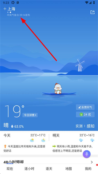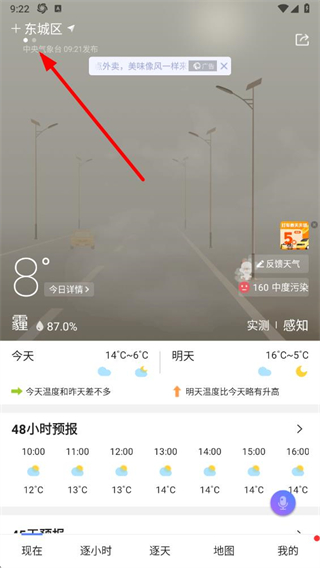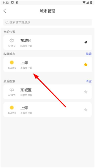 1、在中國天氣app天氣頁面點擊左上角城市名稱區(qū)域,進入城市管理頁面。
