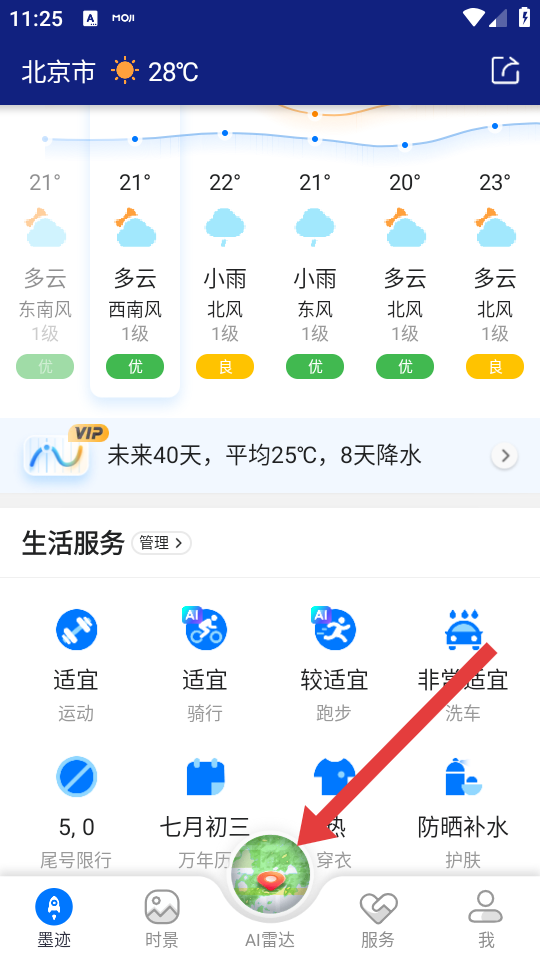 1、打開墨跡天氣APP的主界面,需要點擊底部中間的AI雷達按鈕,進入天氣雷達圖的頁面。