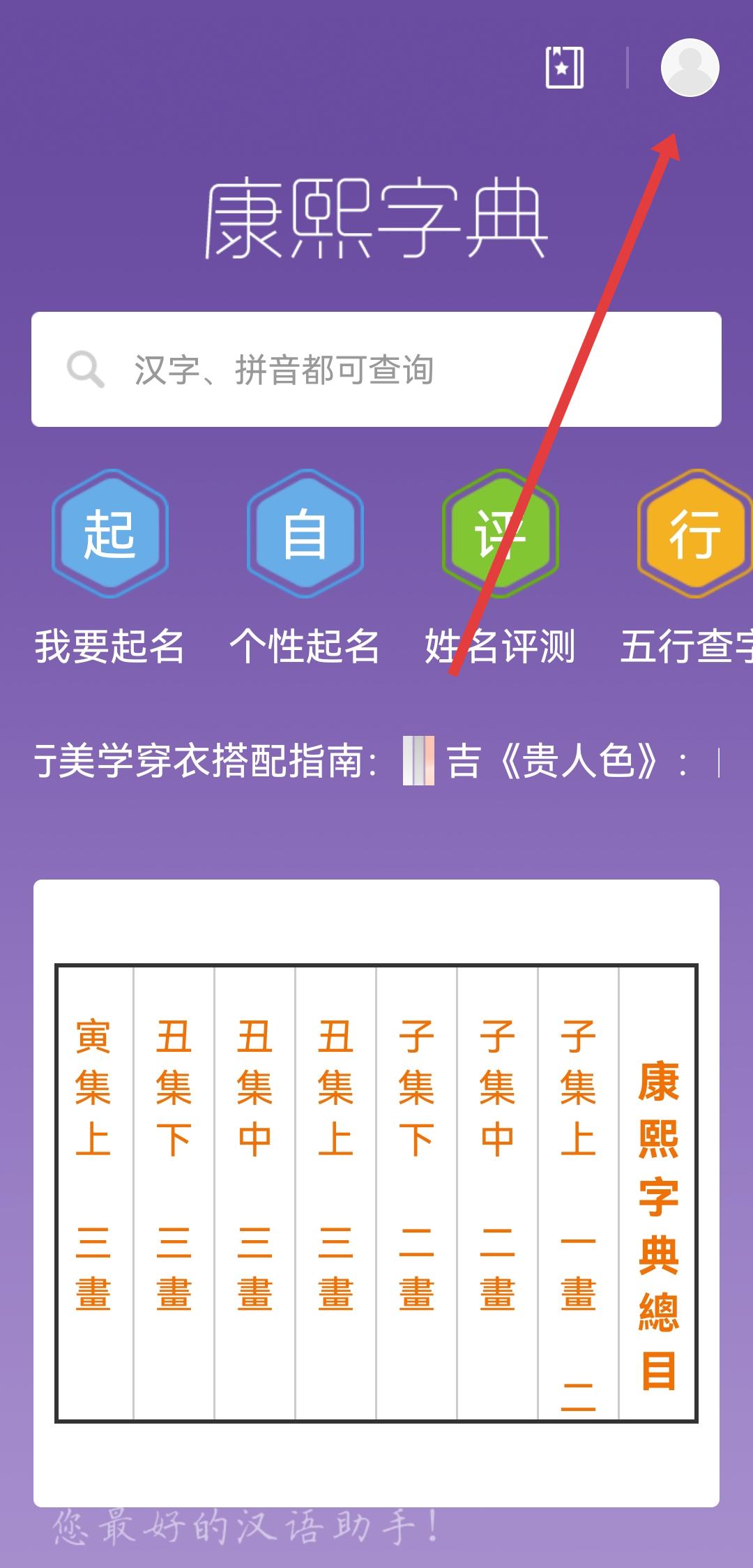 1、打開康熙字典APP,點擊界面右上角的個人頭像,進入我的頁面。