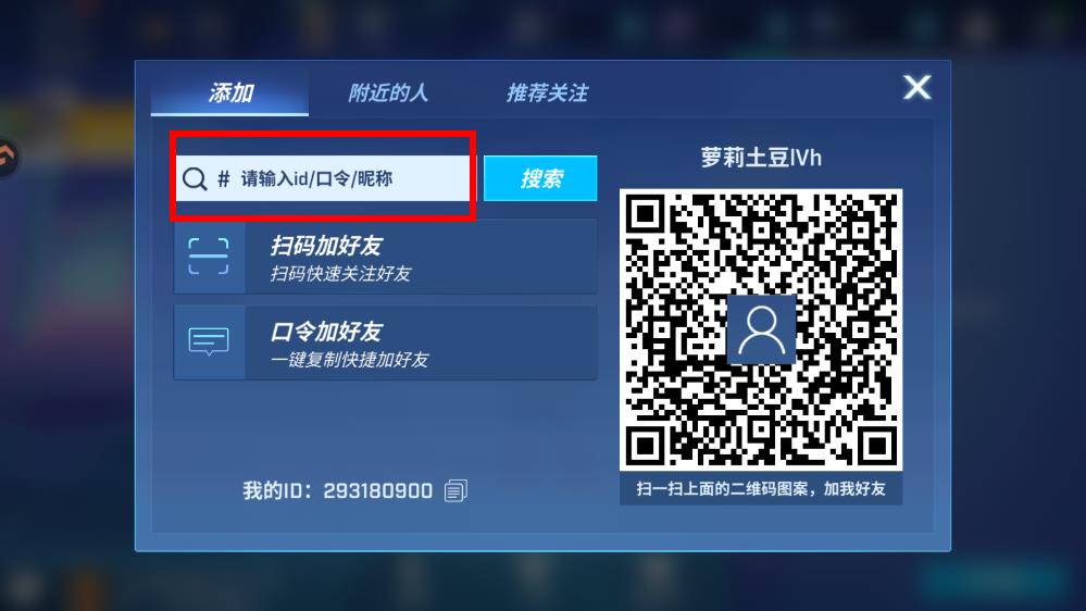 4、在添加好友界面,在輸入框中輸入對(duì)方id、口令或昵稱,點(diǎn)擊搜索,找到目標(biāo)好友后發(fā)送添加申請(qǐng),來(lái)快速添加好友。