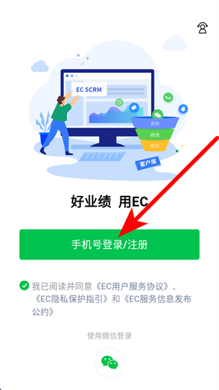 1、打開騰訊EC APP,點擊手機號登錄/注冊的按鈕。