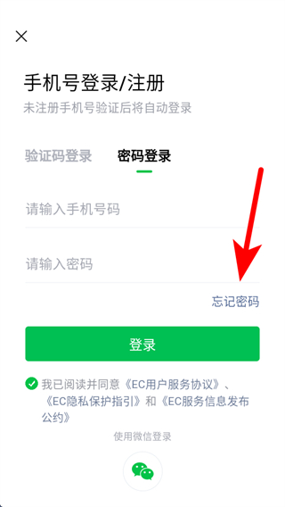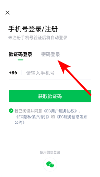 2、在手機號登錄/注冊頁面,點擊密碼登錄的選項。