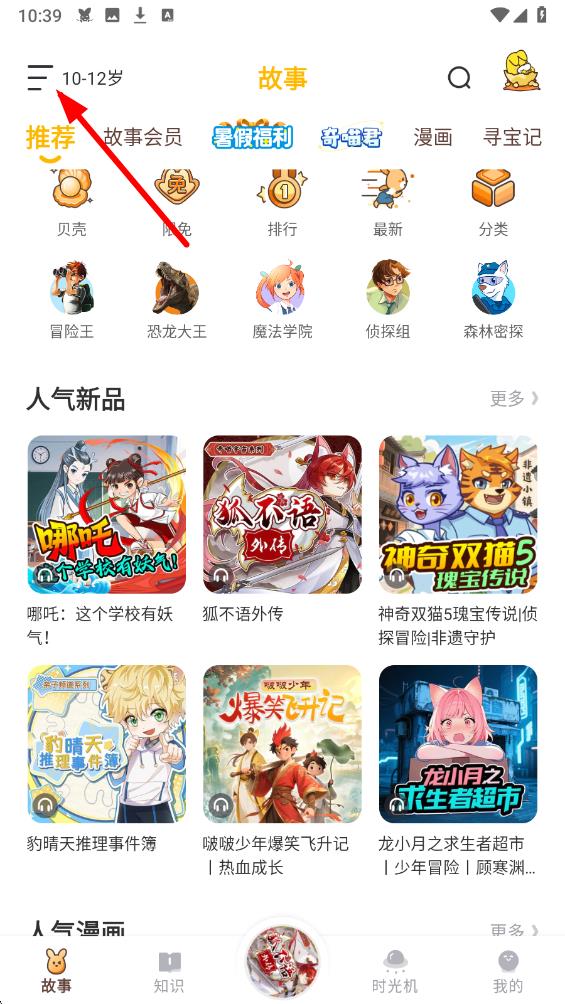 1、打開口袋故事聽聽APP,點擊主界面左上角的三橫線菜單圖標,調出側邊菜單欄。
