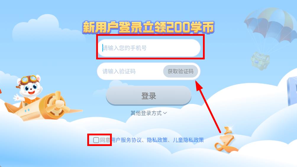 1、打開小學寶應用進入登錄界面,在手機號輸入框內(nèi)準確填入您的手機號,獲取驗證碼填入輸入框中。