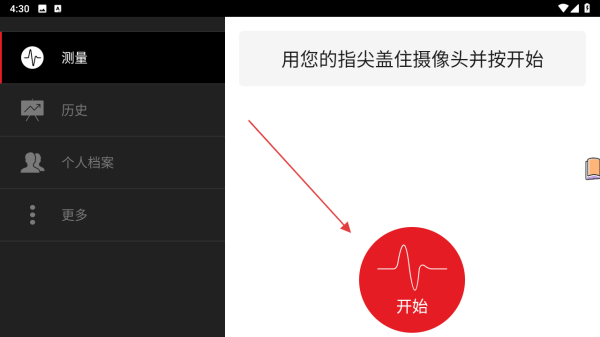 1、打開心率儀應(yīng)用,進(jìn)入測量界面,依據(jù)提示,用指尖蓋住手機(jī)攝像頭,之后點(diǎn)擊界面中紅色的開始按鈕,開始進(jìn)行心率測量。
