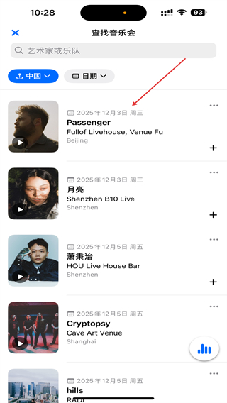 1、啟動(dòng)音樂(lè)雷達(dá)APP,進(jìn)入時(shí)點(diǎn)擊底部音樂(lè)會(huì)的標(biāo)簽。