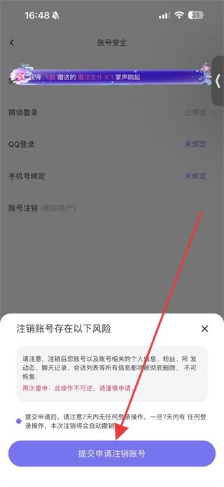 4、在彈出的注銷風險提示框中,點擊提交申請注銷賬號按鈕,按照提示完成賬號注銷操作。