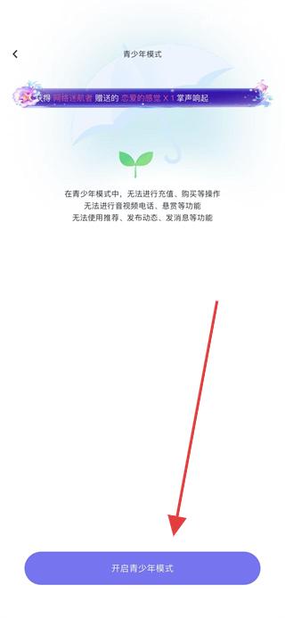 3、在青少年模式說明頁面點擊開啟青少年模式,進入開啟青少年模式設置頁面。