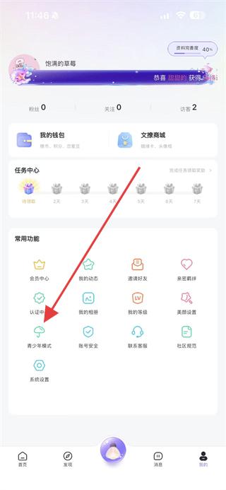 2、在個人頁面中找到青少年模式選項并點擊,進入青少年模式說明頁面。