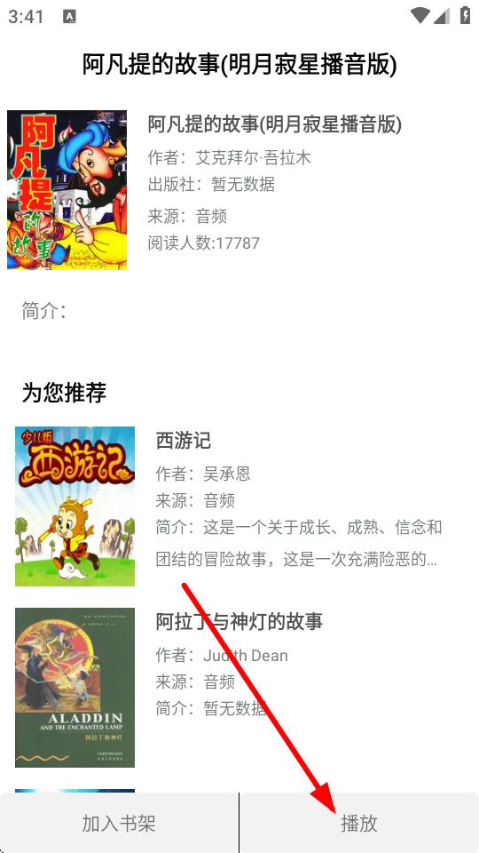 4、點(diǎn)擊選中的書籍進(jìn)入詳情頁,再點(diǎn)擊下方的播放按鈕即可開始聽書。