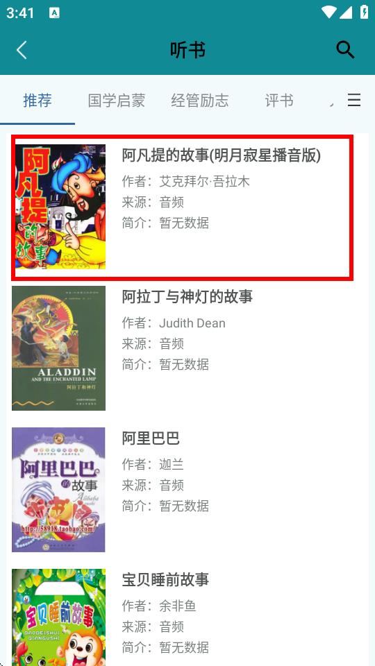 3、在聽書界面瀏覽各類聽書資源,比如阿凡提的故事,阿里巴巴等,選擇想聽的書籍。