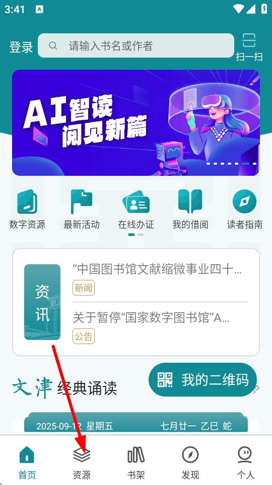 1、打開國家數(shù)字圖書館app,點(diǎn)擊底部導(dǎo)航欄中的資源選項(xiàng)。