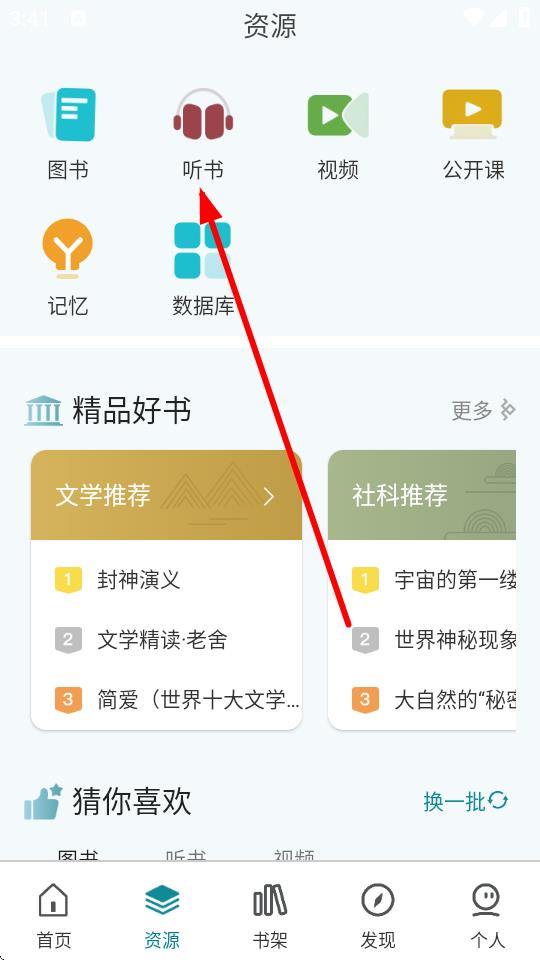 2、進(jìn)入資源頁面后,找到并點(diǎn)擊聽書圖標(biāo)進(jìn)入聽書資源界面。