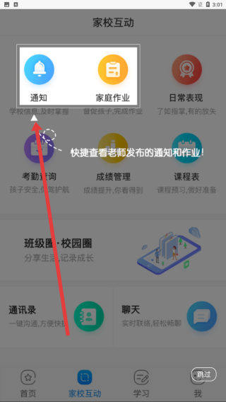 2、進入家?;咏缑婧?,點擊通知圖標,及時掌握學校發(fā)布的消息,跟進孩子學業(yè)相關(guān)的通知內(nèi)容。