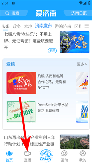 1、在愛濟(jì)南APP首頁(yè),點(diǎn)擊直播選項(xiàng),進(jìn)入直播頻道。