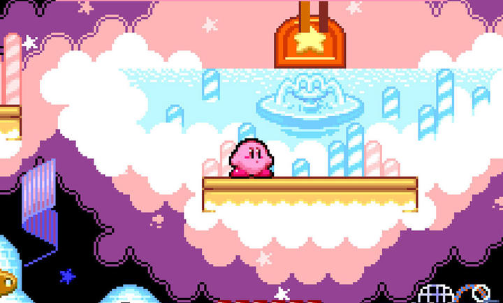 A鍵為跳,再按一下就會含一口氣在肚子里,可以飛起來。從高處(2/3個屏幕高)掉下來,就會大頭朝下落,這樣也是有攻擊力的。在肚子鼓起來的時候按B鍵是吐氣,有攻擊力的,攻擊距離很短。在肚子空的時候按B鍵是吸氣,可以吞掉敵人,就算是有墻隔著的地方也可以吸到。如果是吸到有特殊能力的敵人,按一下十字鍵的下鍵就可以復(fù)制敵人的能力。吸入兩個敵人再按下鍵,就可以用輪盤選擇能力,等它自動停下來的話,是大錘能力;吸入兩個敵人后噴出,噴出的星星有穿透效果。(如果將星星和敵人同時吸入再使用,則使用星星的能力)如果蹲著按B鍵可以做出滑鏟的動作。