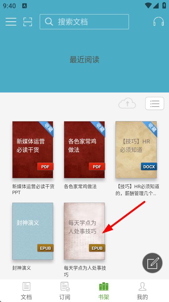 2、在書架頁面的最近閱讀列表里,點(diǎn)擊想要閱讀的文檔,比如每天學(xué)點(diǎn)為人處世技巧。