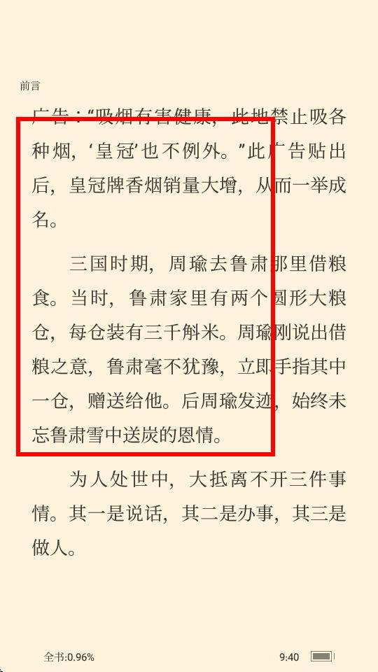 4、繼續(xù)滑動(dòng)屏幕,便能閱讀文檔的正文部分,像書籍里關(guān)于為人處世的案例等內(nèi)容都可查看。