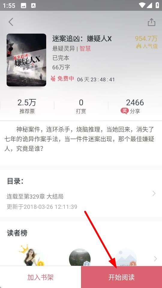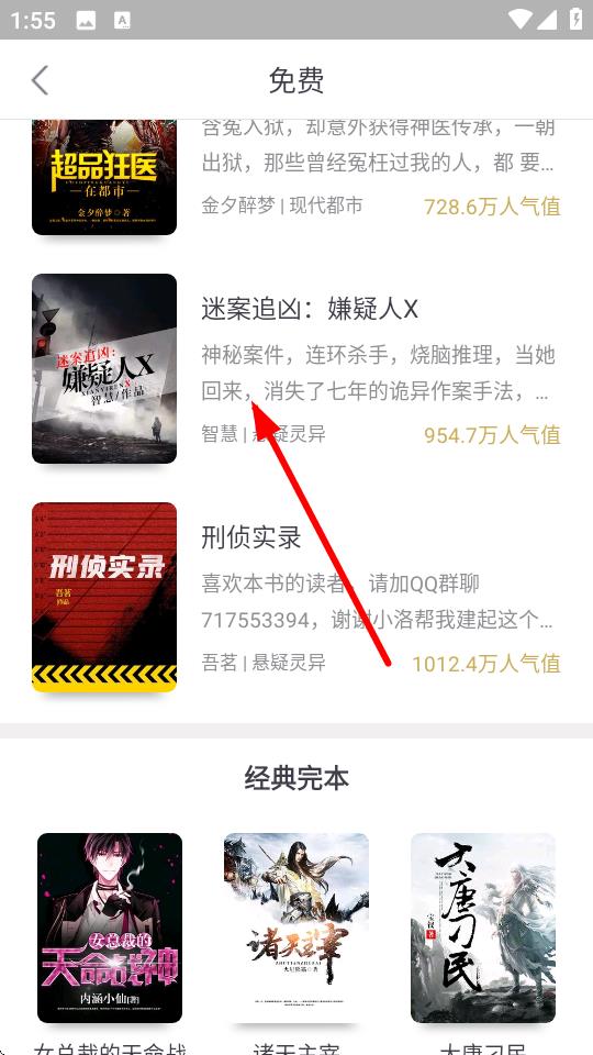 1、打開火星小說app,在免費頁面選擇一本小說,比如點擊迷案追兇:嫌疑人X。