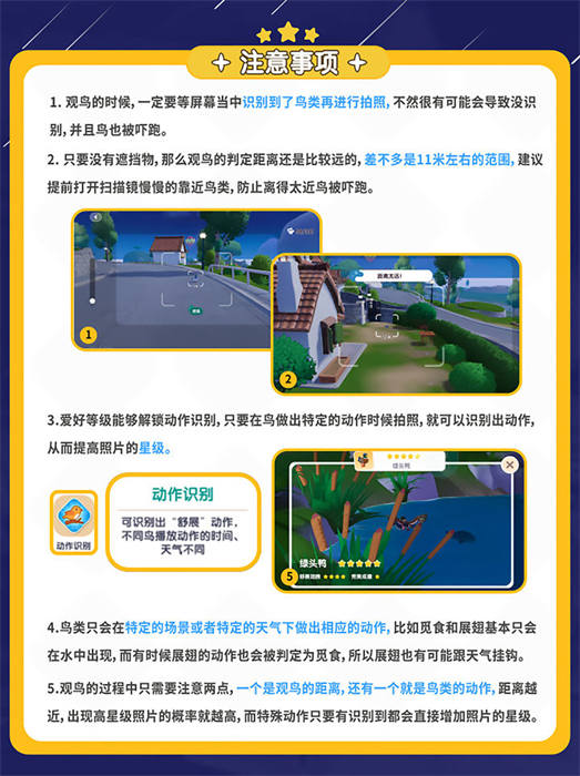 1、在拍鳥的過程中有多種不同的注意事項需要玩家留意,以下是注意事項的總結(jié)圖片,玩家可以詳細(xì)了解;