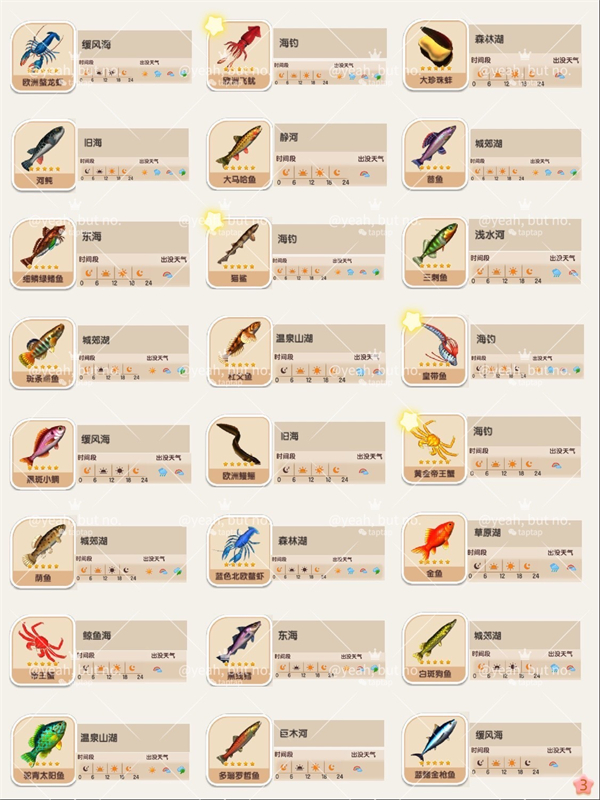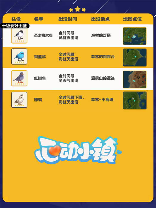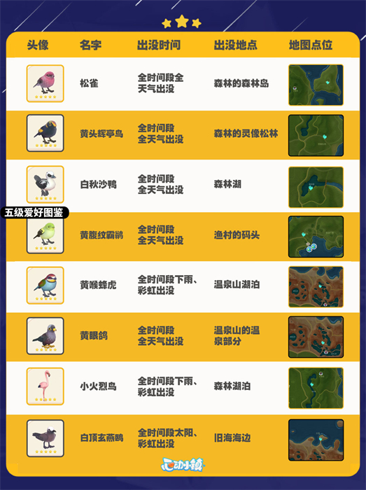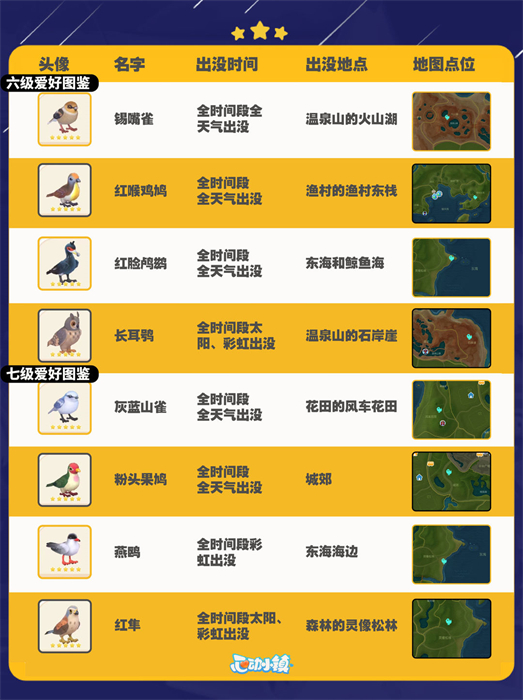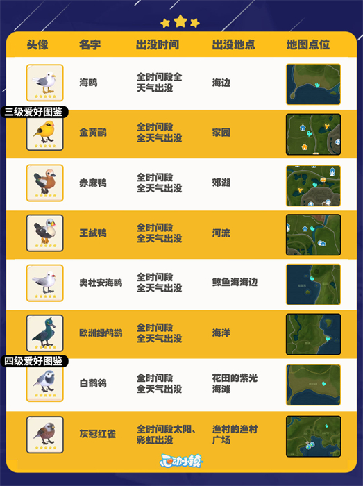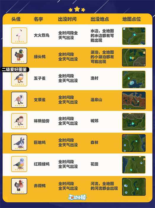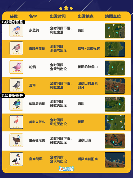 2、不同的鳥類將會有著不同的出沒時間以及出沒地點,且這些鳥類被拍到的價值也不同,故小編總結(jié)了以下所有不同等級鳥類的出沒地點以及時間,可供玩家們更好的進(jìn)行拍鳥。