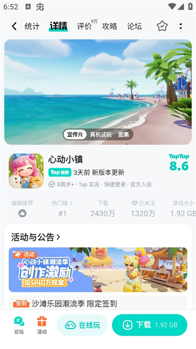 2、使用TAPTAP下載,心動小鎮(zhèn)獨家上線了TAPTAP平臺,所以除了在本頁面下載之外,還可以在TapTap下載,但是需要玩家先下載一個taptap才行,所以還是比較麻煩的,但是也是一種選擇,提供的也是官服,可以放心下載,就算你在官網(wǎng)下載,也是跳轉(zhuǎn)到TapTap下載的。