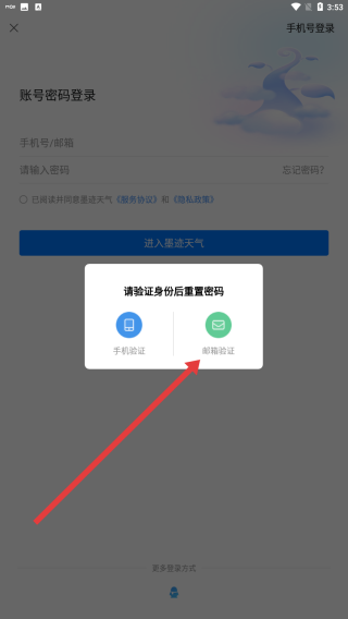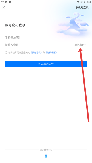 1、進(jìn)入到墨跡天氣賬號登錄頁面中,要是忘記了密碼,可點(diǎn)擊忘記密碼按鈕解決。