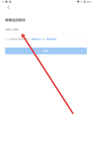 3、在跳轉(zhuǎn)到郵箱找回密碼頁面中,點(diǎn)擊輸入框輸入郵箱后提交完成找回操作。