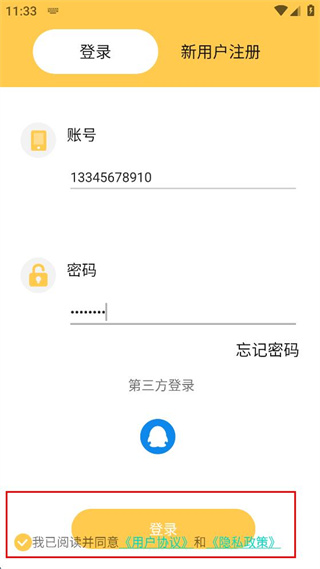 4、勾選同意用戶協(xié)議和隱私政策,點(diǎn)擊登錄按鈕完成登錄操作。
