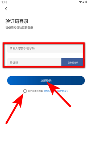 4、在驗(yàn)證碼登錄界面,輸入信息勾選同意,點(diǎn)擊立即登錄按鈕,即可完成賬號注冊并登錄。