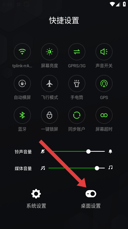 2、在快捷設(shè)置界面中,點(diǎn)擊底部的桌面設(shè)置按鈕,進(jìn)入桌面設(shè)置頁面。