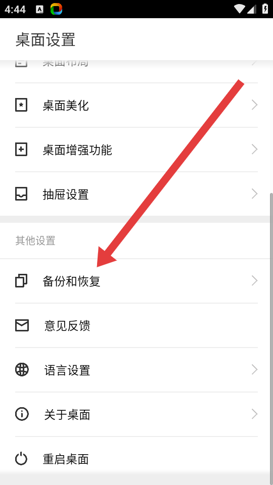 3、在桌面設(shè)置頁面中,找到備份和恢復(fù)選項(xiàng)并點(diǎn)擊,進(jìn)入備份和恢復(fù)設(shè)置頁面。
