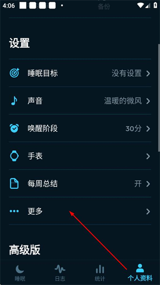 1、打開Sleep Cycle應(yīng)用,點(diǎn)擊底部個(gè)人資料,進(jìn)入個(gè)人資料頁面。