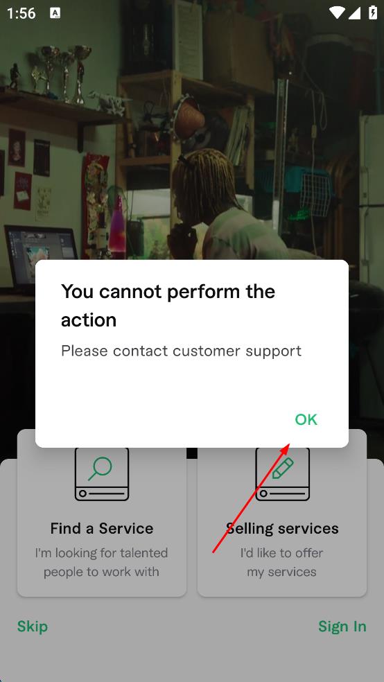 1、打開Fiverr,若出現(xiàn)操作限制提示界面,提示無法執(zhí)行操作需聯(lián)系客服,點擊“OK”按鈕關閉提示。