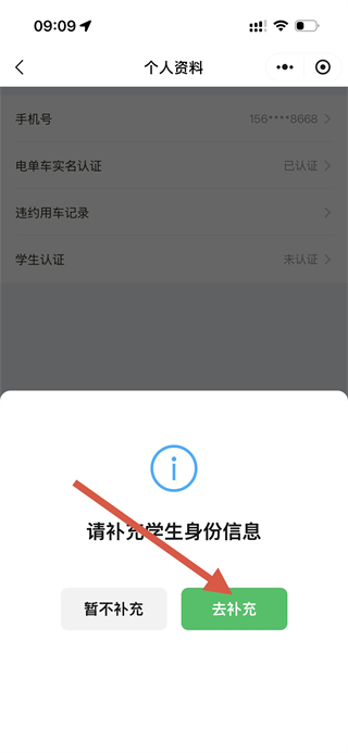 4、在認(rèn)證界面,點(diǎn)擊去補(bǔ)充按鈕,即可進(jìn)行學(xué)生身份信息補(bǔ)充認(rèn)證。