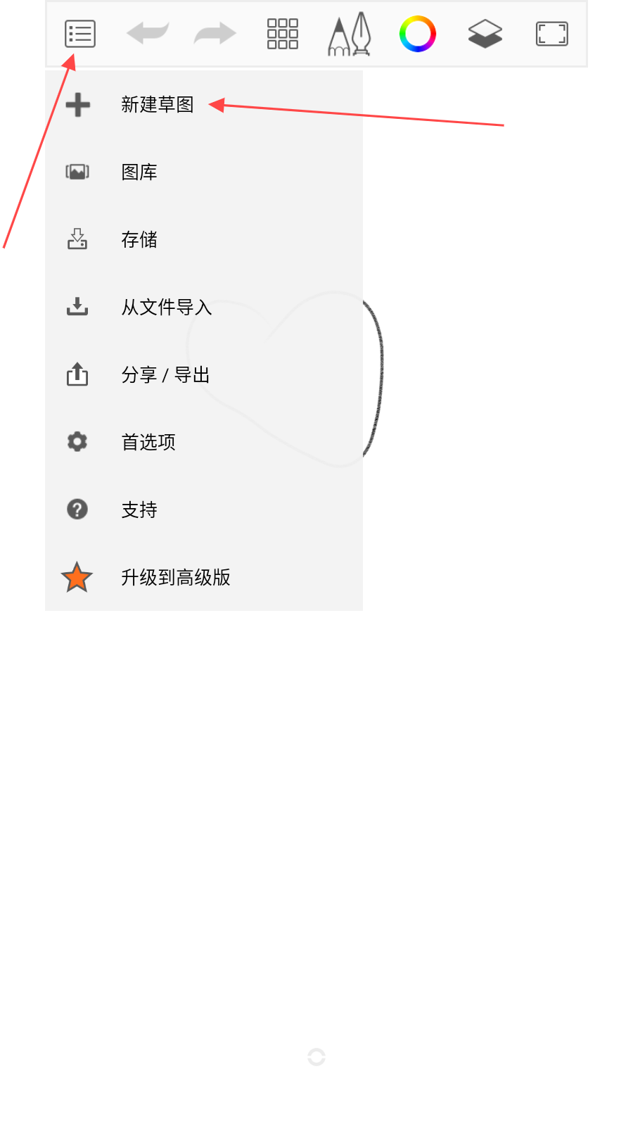 1、打開Sketchbook軟件,點擊界面左上角類似列表的菜單圖標,在彈出的下拉菜單中,點擊新建草圖選項。