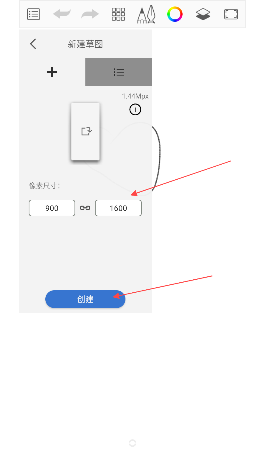 2、進入新建草圖界面后,可以看到像素尺寸的設置選項,根據自身需求在輸入框內設置畫布的寬和高像素值,或者使用默認值。
