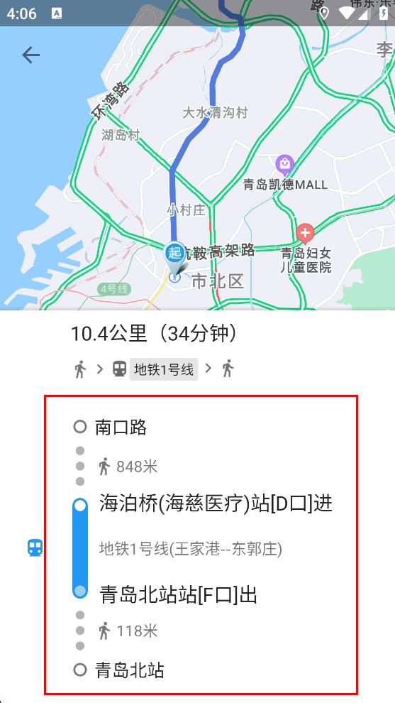 4、選擇好換乘方案后,進入該方案的詳細換乘指引頁面,可查看具體的步行距離、乘坐的公交或地鐵線路以及進出站口等信息,按照指引進行換乘。