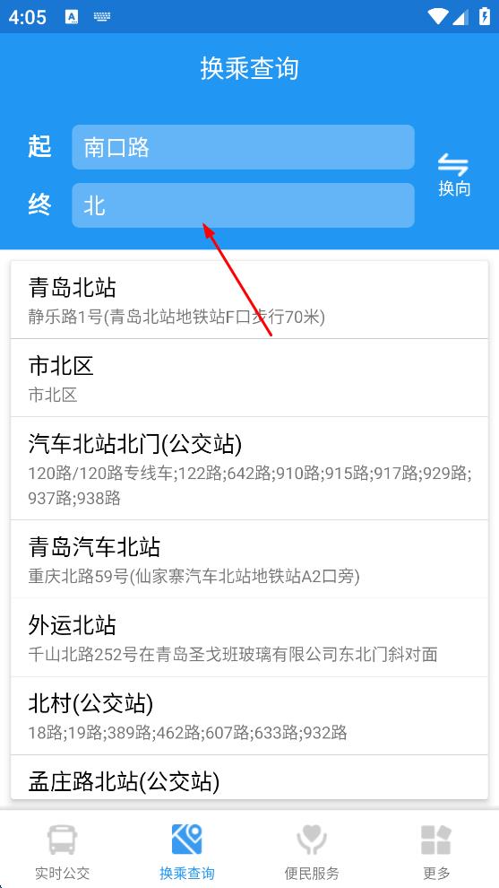 2、輸入目的地后,從彈出的相關地點列表中,選擇準確的目的地,比如“青島北站”。