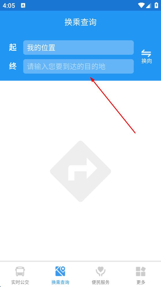 1、打開公交換乘查詢軟件,進入“換乘查詢”頁面,在“起”欄確認或修改出發(fā)位置,在“終”欄輸入要到達的目的地。