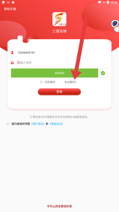 1、在三晉先鋒登錄頁面中,若忘記密碼可以點擊下面的忘記密碼按鈕解決。