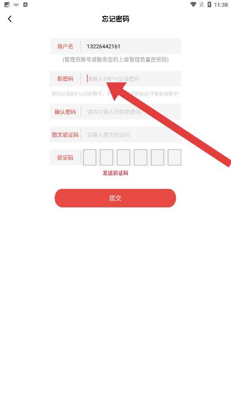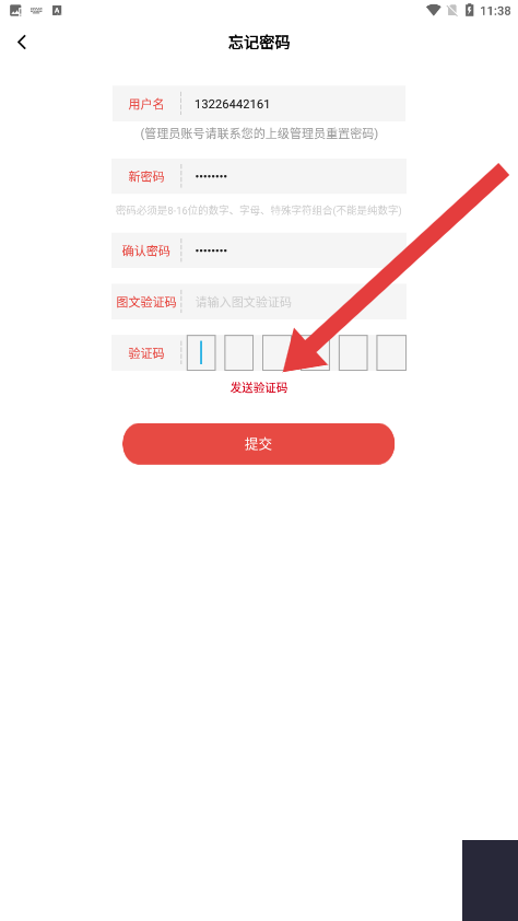 3、在輸入完信息后,點擊發(fā)送驗證碼按鈕,獲取后完成重置密碼操作。