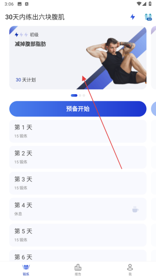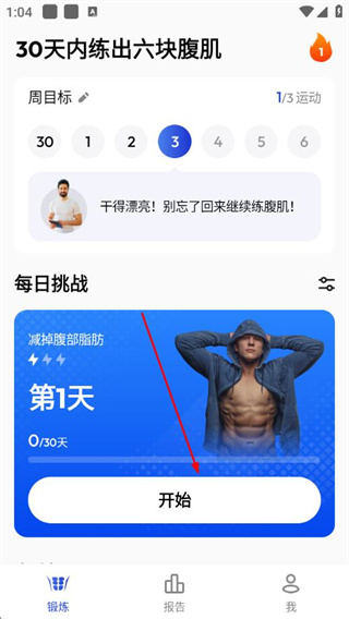 1、打開鍛煉頁面,在每日挑戰(zhàn)板塊點(diǎn)擊開始,進(jìn)入訓(xùn)練計(jì)劃頁面。