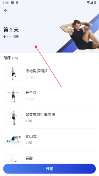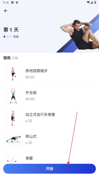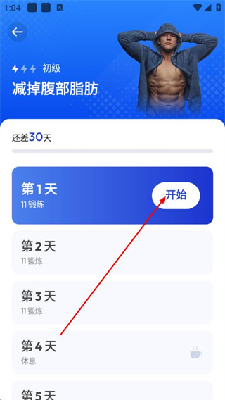 2、在訓(xùn)練計(jì)劃頁面選擇第1天對(duì)應(yīng)的開始,進(jìn)入當(dāng)日訓(xùn)練詳情頁。