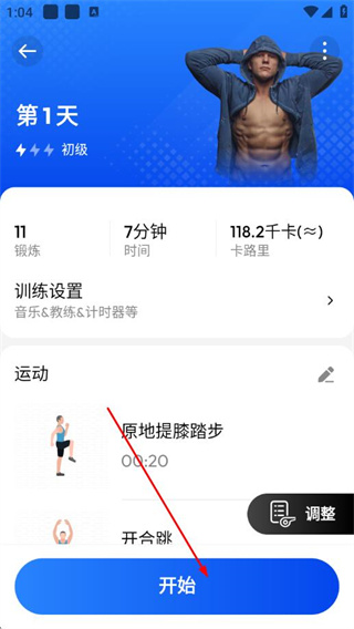 3、確認(rèn)訓(xùn)練內(nèi)容后,點(diǎn)擊開始,跟隨APP動(dòng)作演示與節(jié)奏,完成當(dāng)日訓(xùn)練,堅(jiān)持按計(jì)劃逐天進(jìn)行,把控動(dòng)作標(biāo)準(zhǔn),積累訓(xùn)練成果,邁向目標(biāo)。