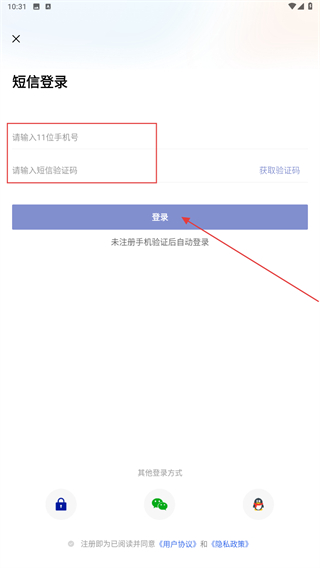 3、在短信登錄的界面內(nèi),輸入手機(jī)號(hào)、驗(yàn)證碼,再點(diǎn)擊登錄即可。